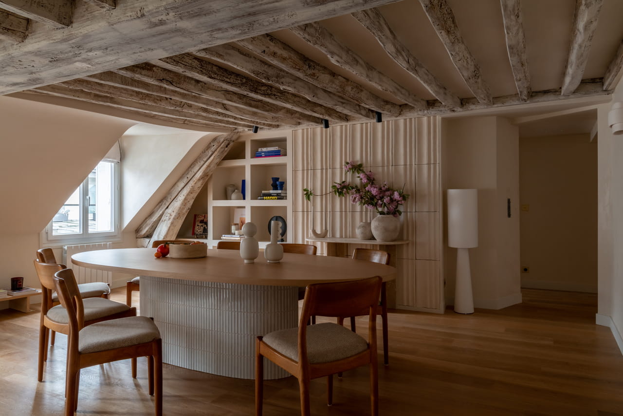Avec ses pièces sous pente, ce vaste 3 pièces parisien n'était pas évident à aménager. L'architecte Elodie Chomet a su déjouer tous les pièges de cette habitation en s'adaptant à ses formes et en jouant sur les matières pour apporter du cachet. Elle a même réussi à créer une salle d'eau et une chambre supplémentaires. Chapeau !Réseau social dédié à l'immobilier, l'habitat et le patrimoine (Architecure, Travaux, Annonces Immo, Home Design, Investissement locatif, Jardinage,...)