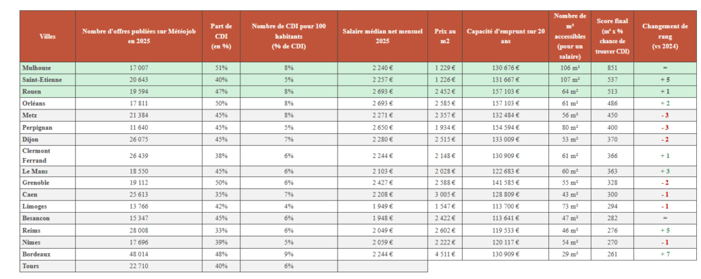 « Mulhouse illustre parfaitement la dynamique des villes où l’emploi et le logement se conjuguent. Même si les salaires y sont plus modestes, l’accessibilité immobilière compense et offre une certaine qualité de vie », explique Marko Vujasinovic, CEO et co-fondateur de CleverConnect, éditeur du jobboard Meteojob.