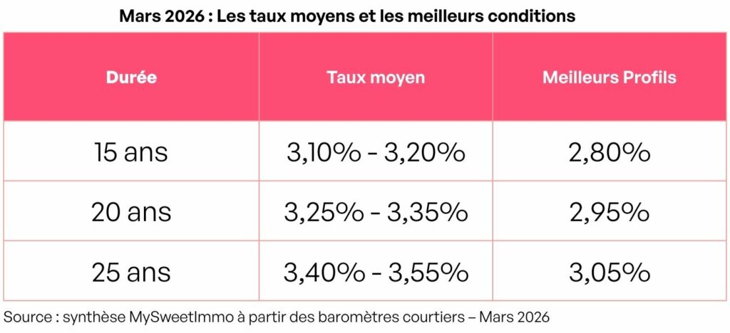 En mars 2026, les taux moyens se situent autour de 3,10 % à 3,20 % sur 15 ans, 3,25 % à 3,35 % sur 20 ans et 3,40 % à 3,55 % sur 25 ans selon les baromètres communiqués par les réseaux de courtage. Les meilleurs dossiers peuvent obtenir des conditions proches de 3 %.